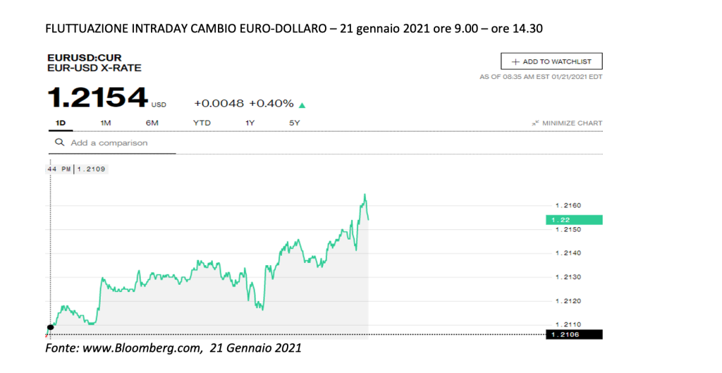 All’esordio in conferenza stampa BCE il rendimento del Bund decennale ha toccato un massimo a -0.4923 alle 14.50 dopo aver toccato un minimo -0.5375 nella mattinata alle 9.13. In conferenza stampa Christine Lagarde ha ribadito che la BCE continuerà a monitorare gli sviluppi del tasso di cambio dell’euro. In tale ambito, continua la corsa al rialzo dell’euro, con la divisa europea che ha toccato un massimo della sessione a 1,2170 dollari prima di ritirarsi leggermente, reagendo ai commenti di Lagarde sui rischi al ribasso meno pronunciati e alle aspettative riguardo un possibile aumento dell’inflazione nei prossimi mesi.
