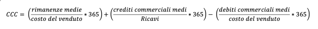 - Cash Convertion Cycle, ovvero il tempo medio (espresso in giorni) necessario all’azienda per trasformare la materia prima in liquidità e così calcolato: