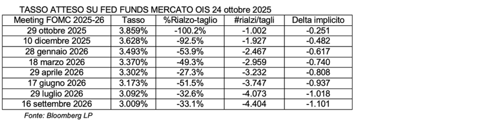 Come atteso dai mercati finanziari, il 29 ottobre 2025 la Fed ha tagliato i tassi di 25 basis point: