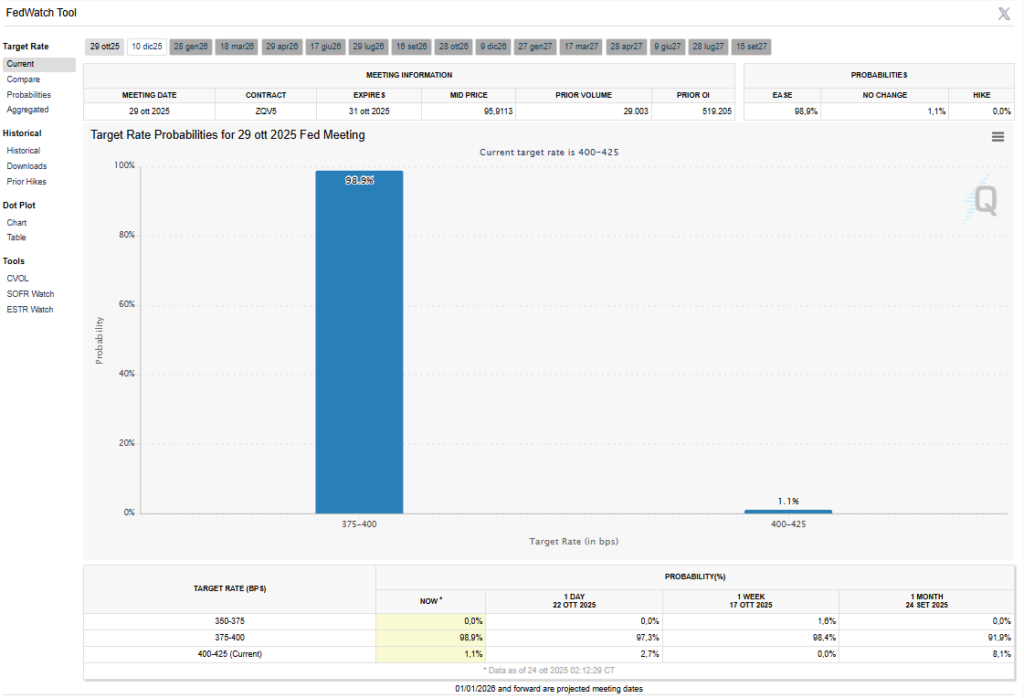 Nel mattino del 24 ottobre 2025 alle ore 8.50, secondo lo strumento previsionale Chicago Mercantile Exchange FedWatch tool, per il meeting FOMC di ottobre si osservava una probabilità del 98.9% di taglio di 25 basis point dell’intervallo Fed Funds rate target a 3.75%-4.00% dagli attuali 4.00%-4.25% e una probabilità dell’1.1% di invarianza del range a 4.00%-4.25%. Il CME FedWatch tool aveva centrato la previsione relativa alla decisione FOMC del 29 ottobre.