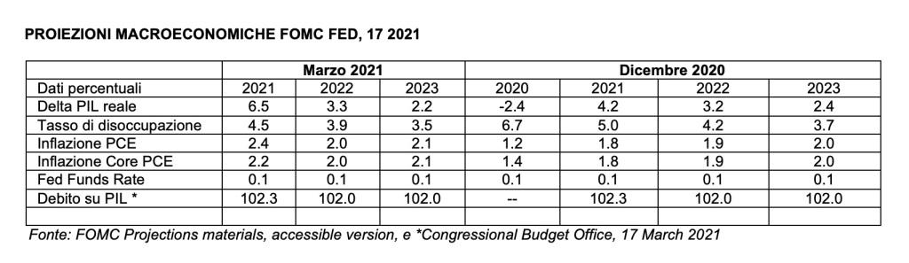 Tra i dati indicati nelle proiezioni macroeconomiche pubblicate il 17 marzo, spiccavano tre variabili importanti: l’invarianza dei tassi sui Fed Funds allo 0.10% per almeno tre anni, l’aumento significativo del tasso d’inflazione ‘core’ per il 2021 dall’1.8% atteso a dicembre 2020 all’attuale proiezione del 2.2% e infine il balzo del PIL al +6.5% contro una previsione di dicembre al 4.2%.