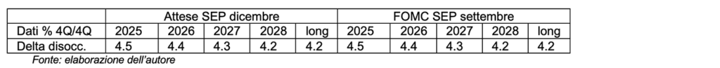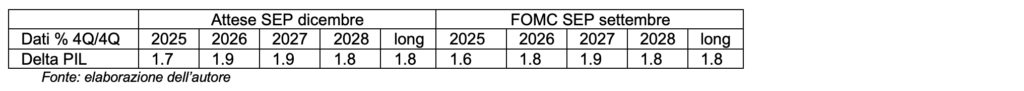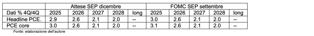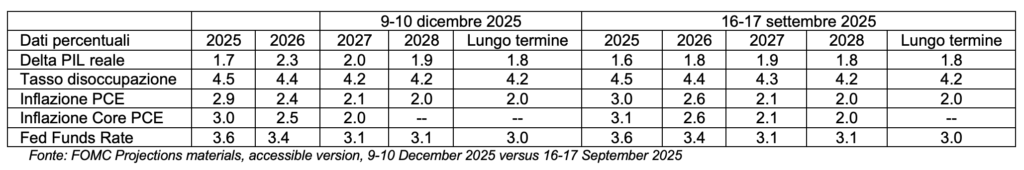 Di seguito, l’estratto delle proiezioni macroeconomiche FED aggiornate (SEP) al 10 dicembre 2025 e il confronto con stime di settembre 2025: