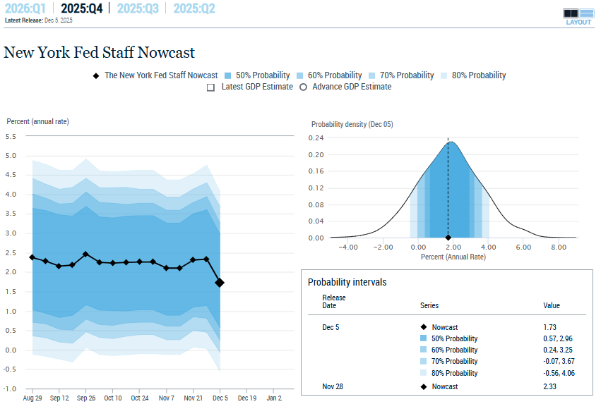 La previsione immediata dello Staff della Fed di New York al 5 dicembre per il quarto trimestre del 2025 era dell’1,7%, con l’intervallo di probabilità del 50% a [0,6, 3,0] % e l’intervallo dell’80% a [-0,6, 4,1] %. La previsione immediata dello Staff per il primo trimestre del 2026 era del 2,2%. Gli aggiornamenti Nowcast dello staff per il terzo trimestre del 2025 si erano conclusi il 28 novembre 2025, a causa della riprogrammazione della pubblicazione della stima anticipata del PIL del Bureau of Economic Analysis per tale trimestre.