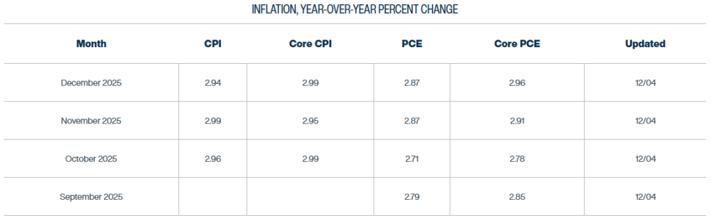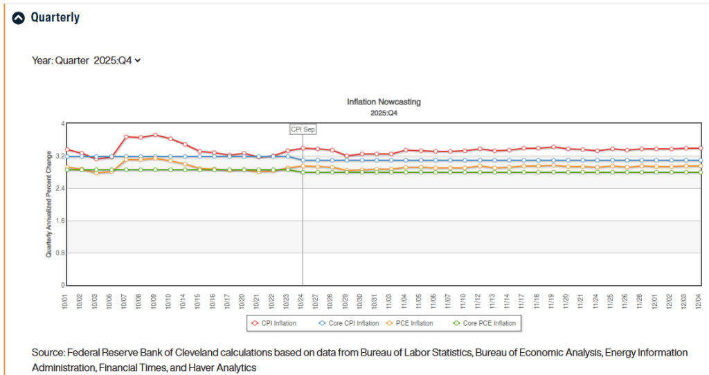 Per Cleveland Fed, nella proiezione prodotta a fine novembre 2025, si evidenziava un aumento del CPI core dal 2.95% di novembre al 2.99% di dicembre, una invarianza della PCE a2.87% e un aumento da 2.91% a 2.96% della PCE core.