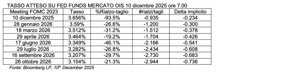 Di seguito, ipotesi del mercato derivati di tasso OIS al mattino del 10 dicembre 2025. Si notavano almeno due tagli 2026:
