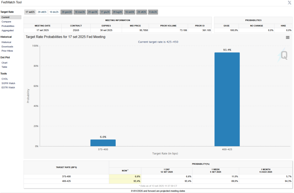 Il 5 dicembre 2025 alle ore 12.12, a cinque giorni dallo Statement Fed, lo strumento previsionale sui tassi Chicago Mercantile Exchange Watchtool indicava una probabilità dell’87.2% che il FOMC riducesse l’intervallo target di 25 basis point portando il range a 3.50%-3.75% e una probabilità del 12.8% di invarianza del range a 3.75%-4.00%. Previsione corretta.