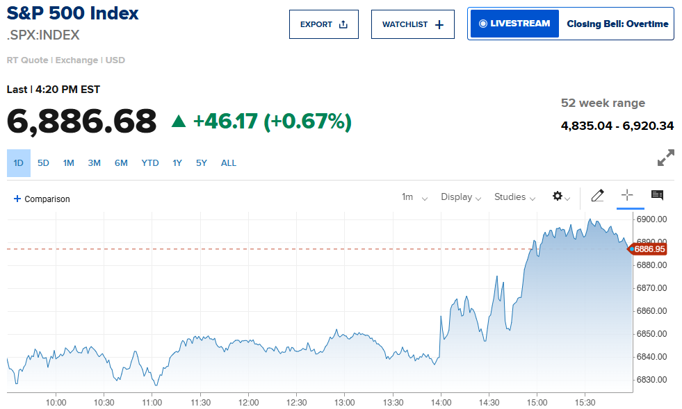 - l’indice S&P500 dopo essersi attestato a 6861.9399 alle 20.00 è sceso fino a 6843.770 alle 20.27