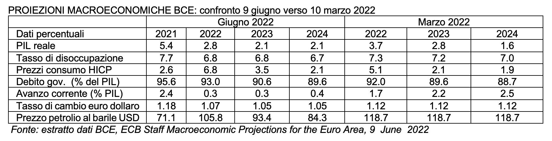 - alcuni esperti ipotizzavano che BCE proiettasse una crescita 2022 al +2,9%, riducendola di 80 basis point rispetto al dato di marzo (+3.7%).