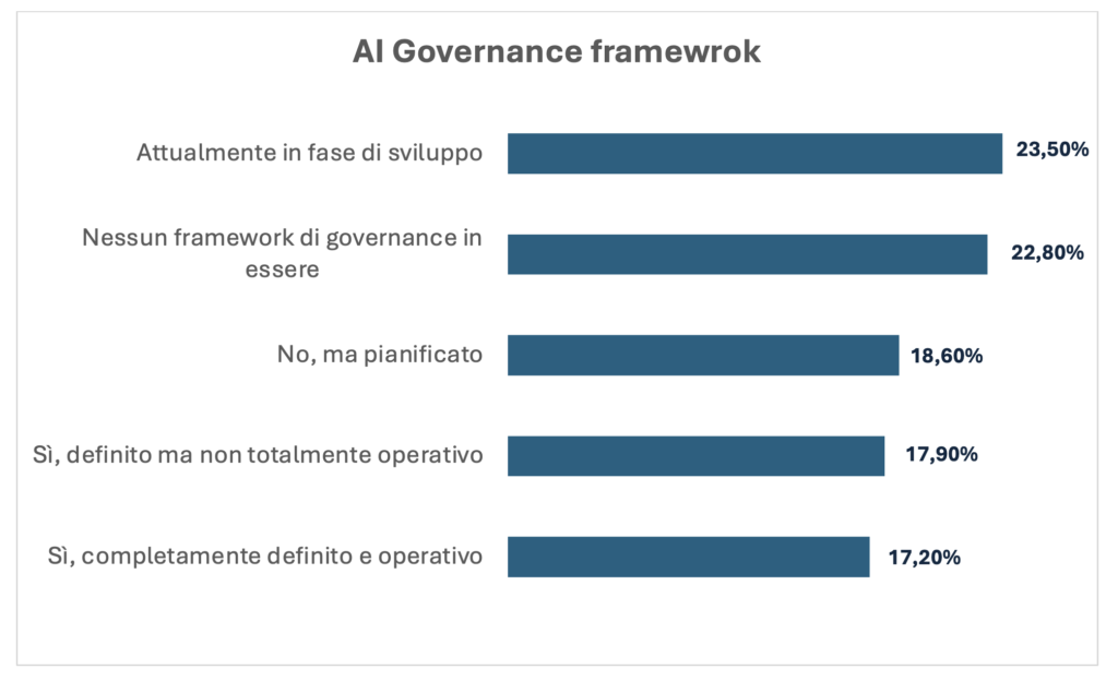 In molte organizzazioni non esistono strutture di AI governance adeguate, comitati dedicati e coordinamento interno tra le funzioni di business e lo sviluppo dei progetti AI. Ciò rende molto spesso difficile passare dalla fase di sperimentazione ed analisi all’effettiva fase di implementazione operativa dei modelli AI su vasta scala. Dalle risposte al sondaggio è evidente che molte organizzazioni non abbiano ancora una AI Governance strutturata: solo il 17% ha infatti dichiarato di avere un framework di AI Governance pienamente operativo